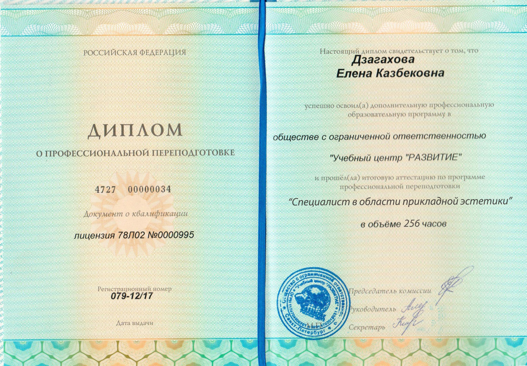 Диплом Государственного Образца «СПЕЦИАЛИСТ В ОБЛАСТИ ПРИКЛАДНОЙ ЭСТЕТИКИ» (256 часов)