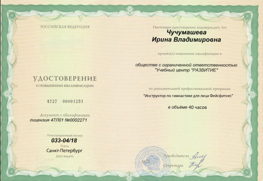 Удостоверение Государственного Образца «ТРЕНЕР ПО ФЕЙСФИТНЕСУ» (40 часов)